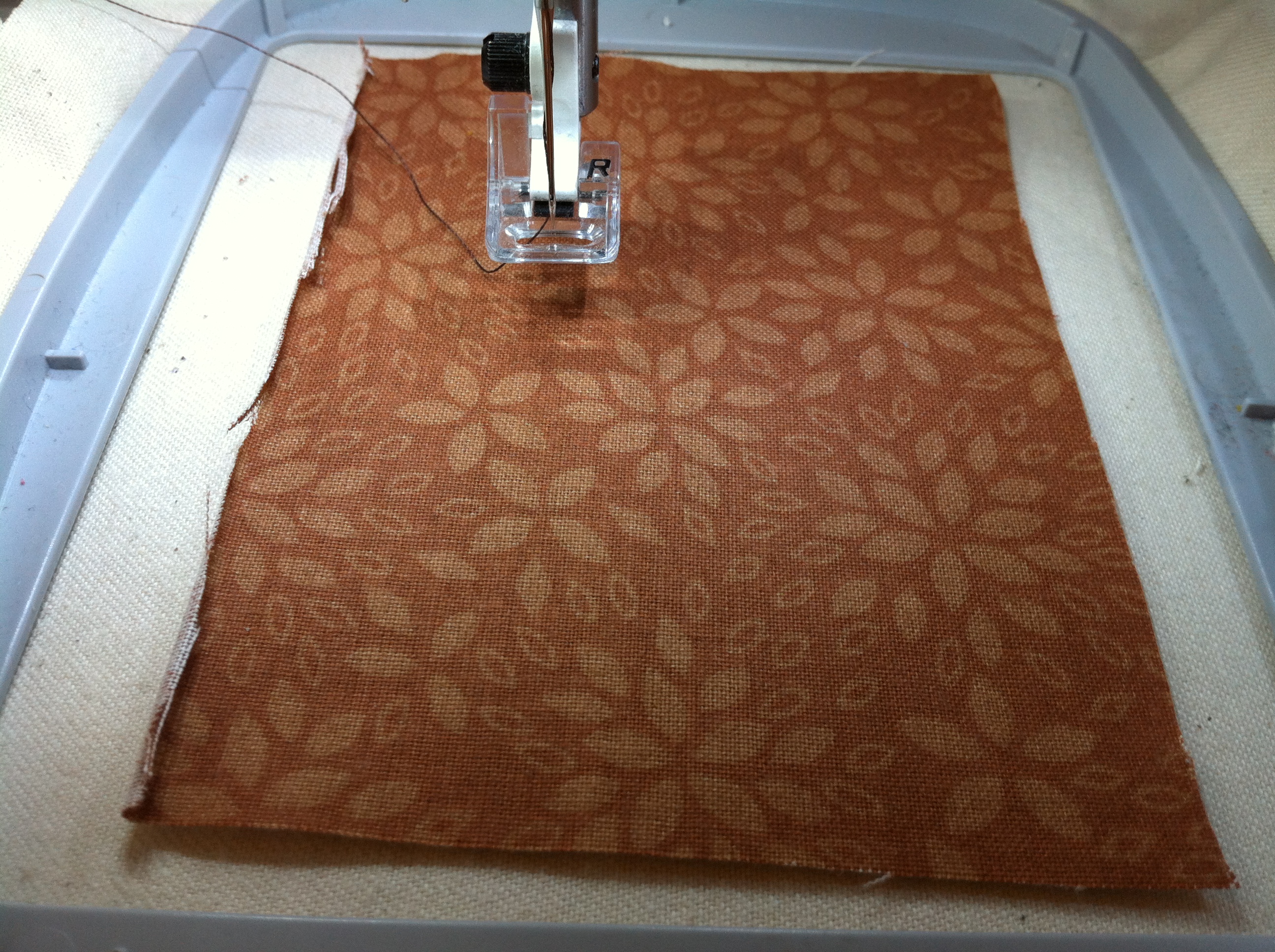 Hoop with the appropriate stabilizer and either hoop your fabric or do a fix stitch to keep it in place.