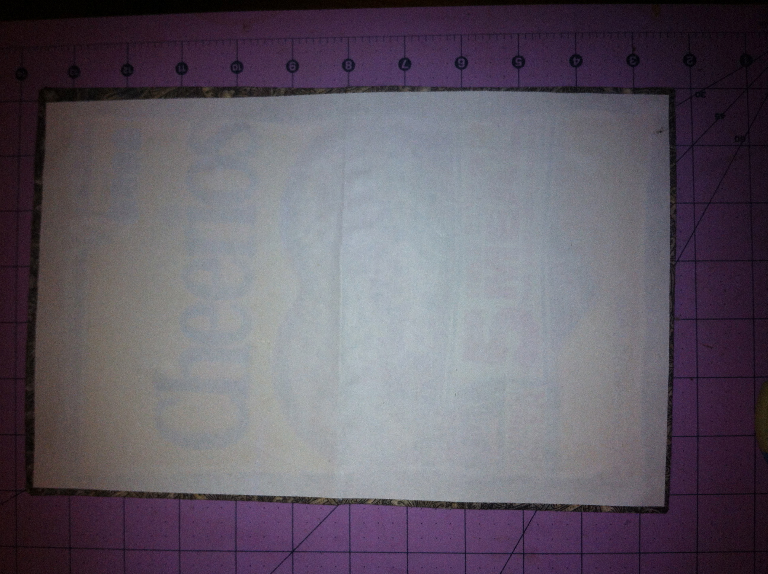 First, cut the cereal box. You will only be using the front or the back. remove the sides, top and bottom leaving a large rectangle. Then measure and cut your fabric 2 inches larger, or an inch larger on every side. I just place the box on top and cut and inch larger all around.