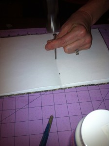 Now it's time to make holes in the paper and the cover to insert the yarn to create a binding. Lay all the pages into the cover and mark a middle point and then two more points in the center of the middle point and the top of the paper (and bottom). Then hammer your awl or large nail at those points to make large enough wholes for the yarn. I will start on the inside and the turn it and hammer from the outside as well.