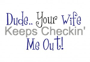 The Dude Your Wife is Checkin' Me Out design includes PDF color sheet and three sizes to fit 4X4 5X7 and 6x10 hoops