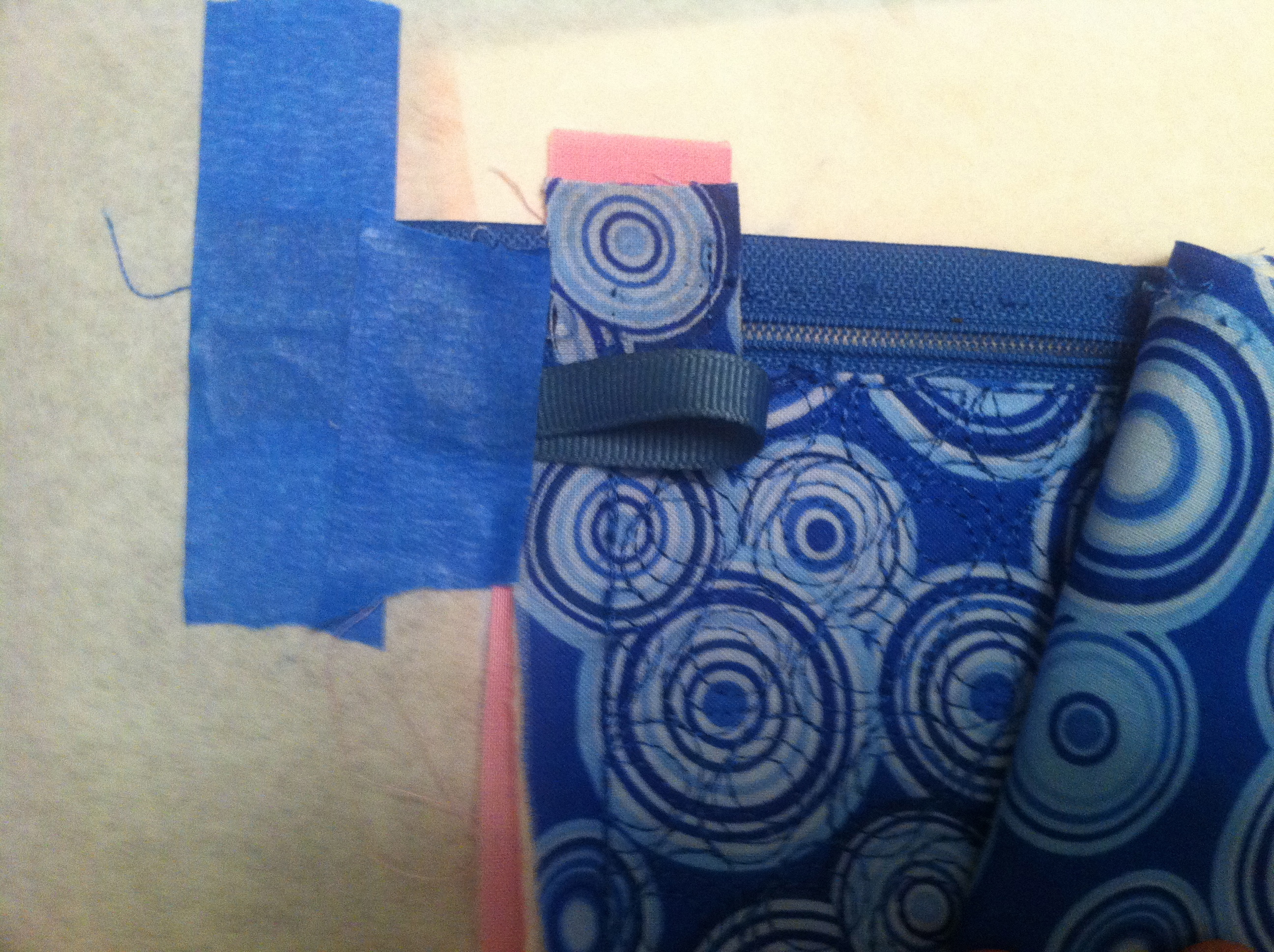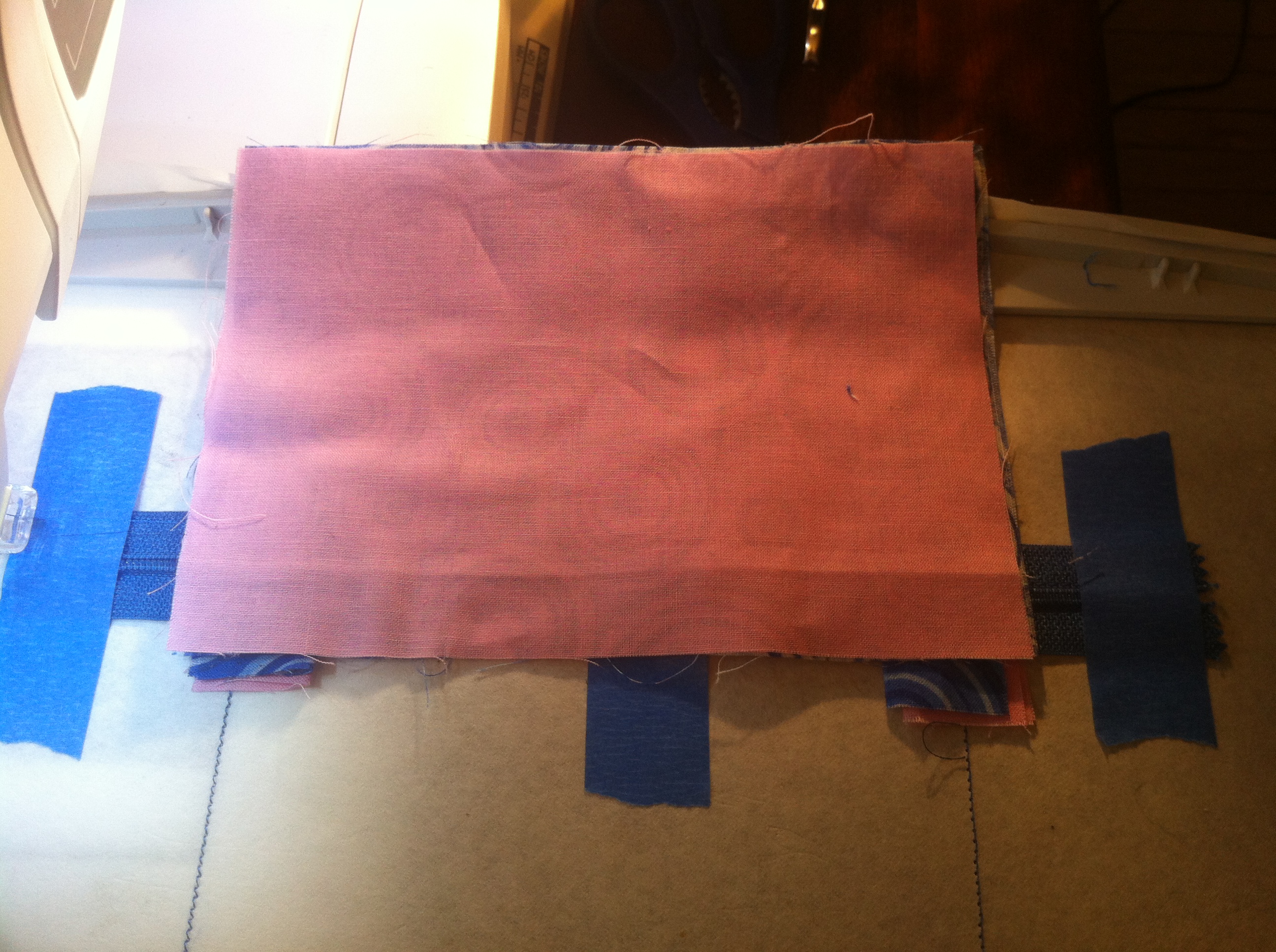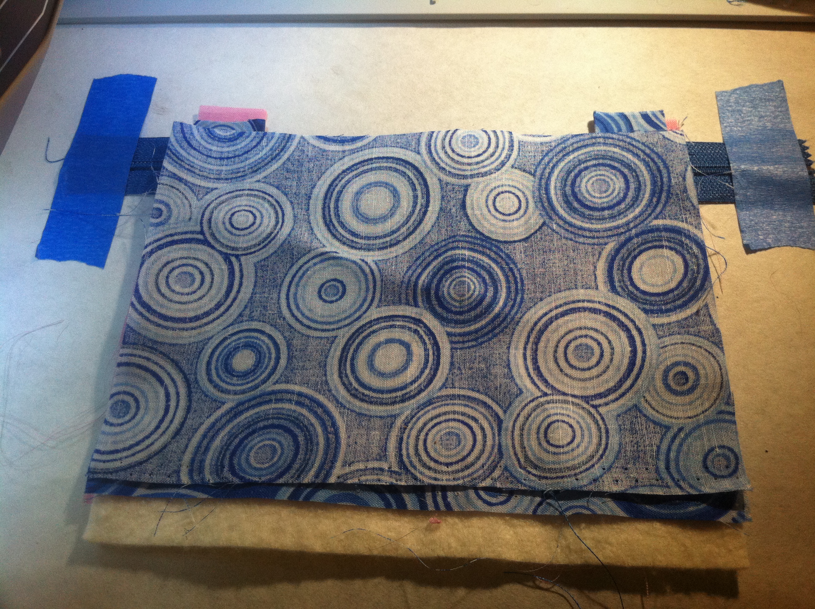 Now place the zipper between the two narrow lines over the lining fabric and tape on both ends. Unzip half way then tape the zipper closed.