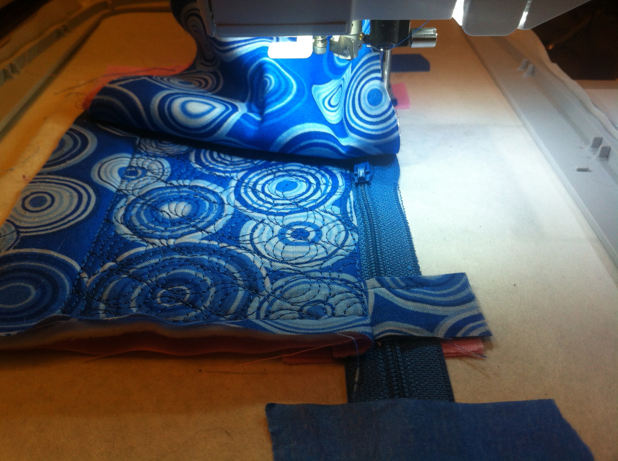 Now place the lining fabric directly over the main fabric. Then stitch step 4, this will stitch the fabric to the zipper stopping halfway through to move the zipper back. My machine did not want to stitch over the zipper pull so I pulled the fabric up after I stopped the machine and removed the tape and zipped it up.