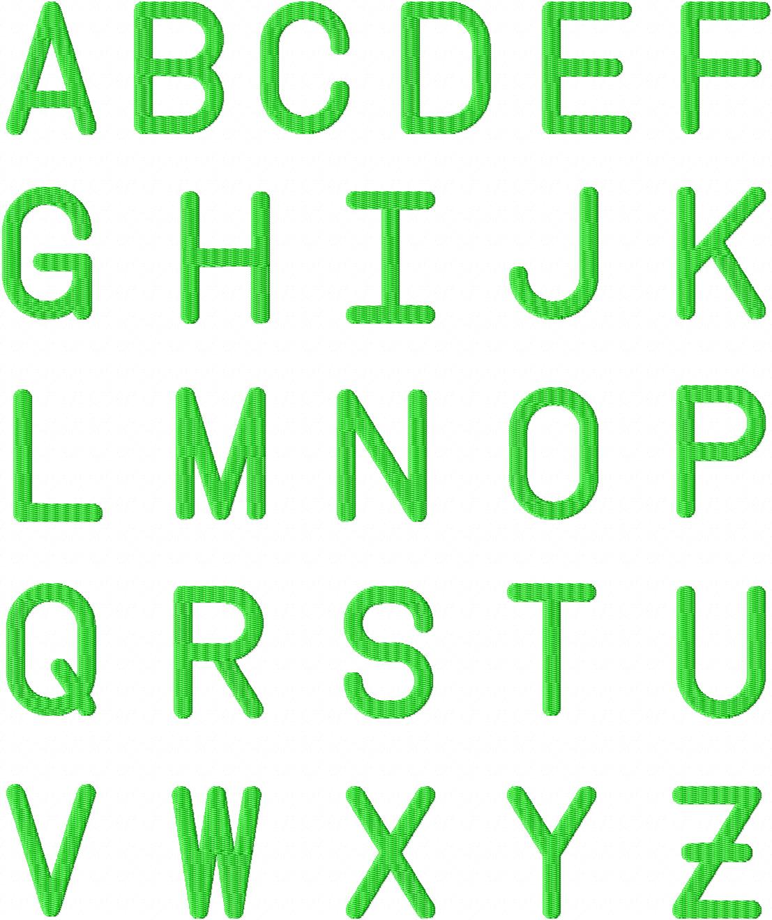 The Follow Direction Font includes Uppercase Letters, Numbers and Punctuation in .75" 1" and 1.5" sizes. .75" is done in Satin Stitch and 1" and 1.5" in Fill Stitching.