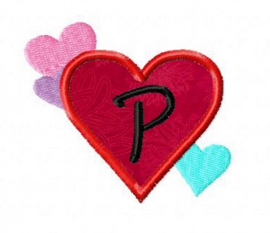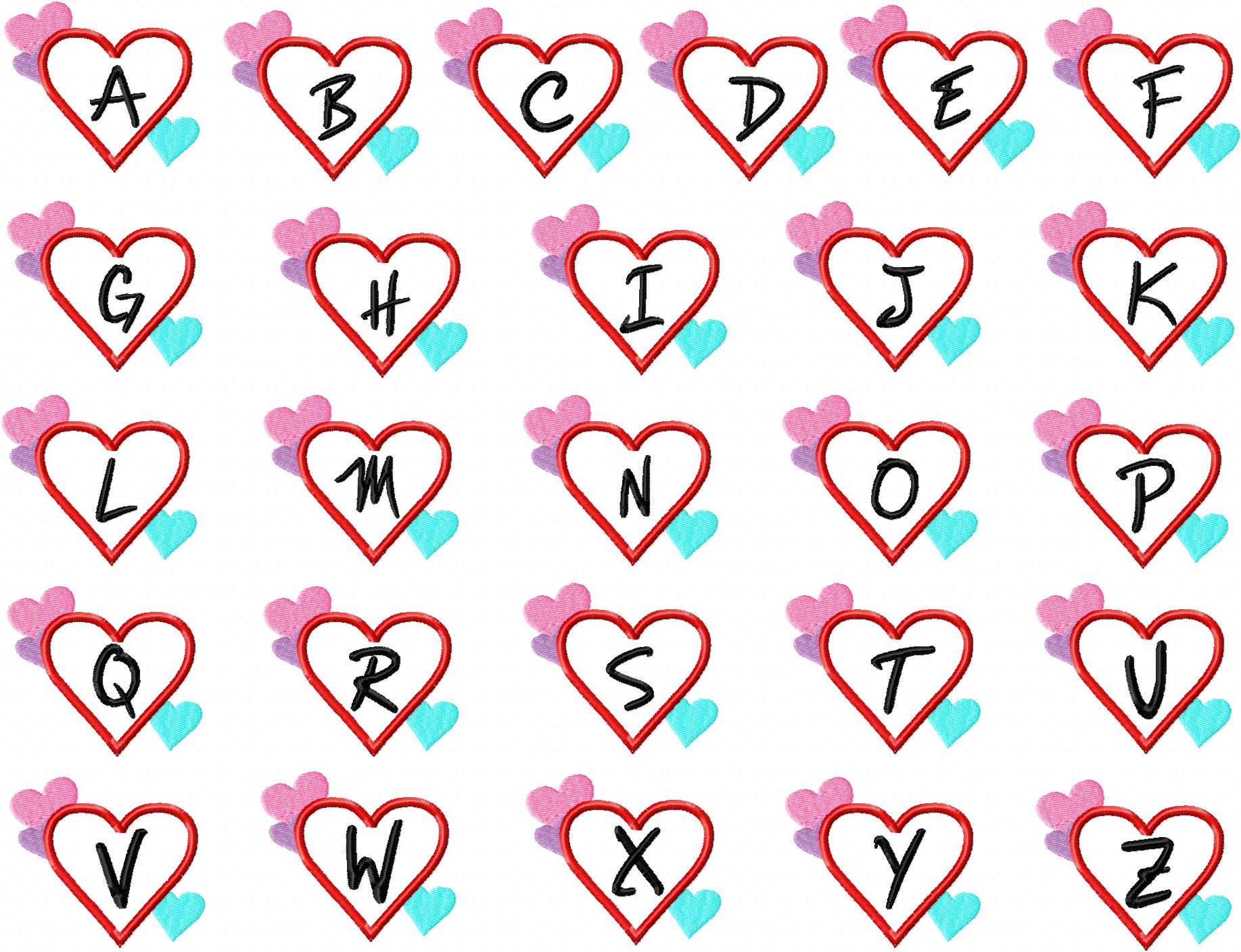 The Heart Frames Machine Embroidery Applique Font Set includes Uppercase Letters and One Blank each in a 3" size to fit 4X4 hoops