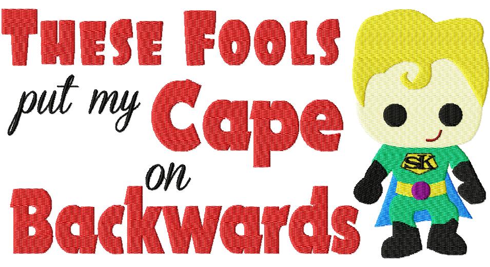 The These Fools Put My Cape On Backwards Designs includes PDF color sheet and three sizes to fit 4X4 5X7 and 6X10 Hoops
