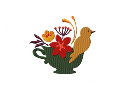 Autumn Bird In Green Teacup Machine Embroidery Design