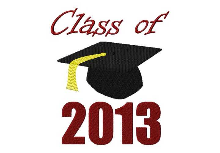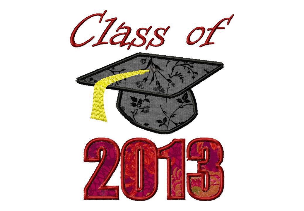 The Class of 2013 Machine Embroidery Design includes both applique and filled stitch, PDF color sheet and each in three sizes to fit 4X4 5X7 and 6X10 Hoops