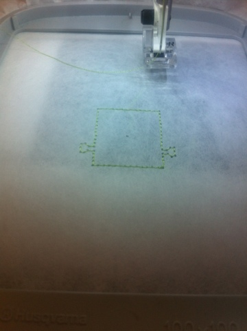 Next, cut out two pieces of felt and place over the die line. Now follow the thread changes, step two which is the the redwork tackdown, step three is the eyes and tooth, step four is mouth and eyebrows, step five is the scar and step six is the neck pegs.
